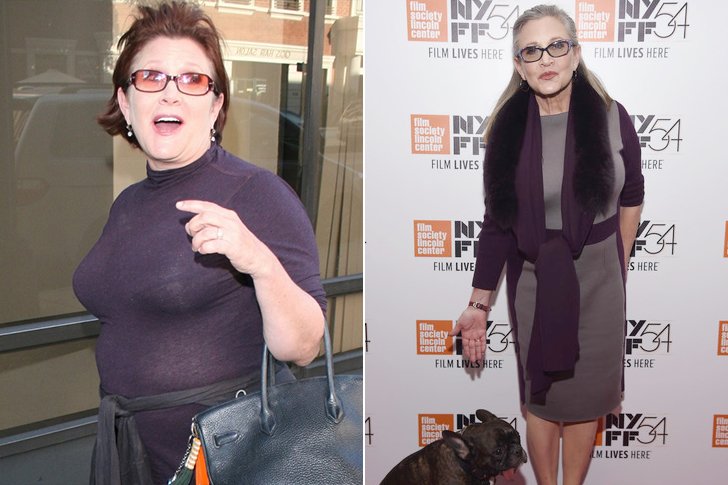 Carrie Fisher é conhecida principalmente por seu papel como Princesa Leia em Star Wars. Fisher lutou por muitos anos com seu peso, transtorno bipolar e dependência de drogas. Para o novo filme de Star Wars: O Despertar da Força em 2015, Fisher estava pronta para fazer mudanças no estilo de vida. Ela começou a tomar seus medicamentos ISRS para tratar sua depressão e transtorno bipolar e começou a se exercitar com um personal trainer que também a ajudou a mudar sua dieta. Ela perdeu 18 quilos e parece melhor do que nunca.