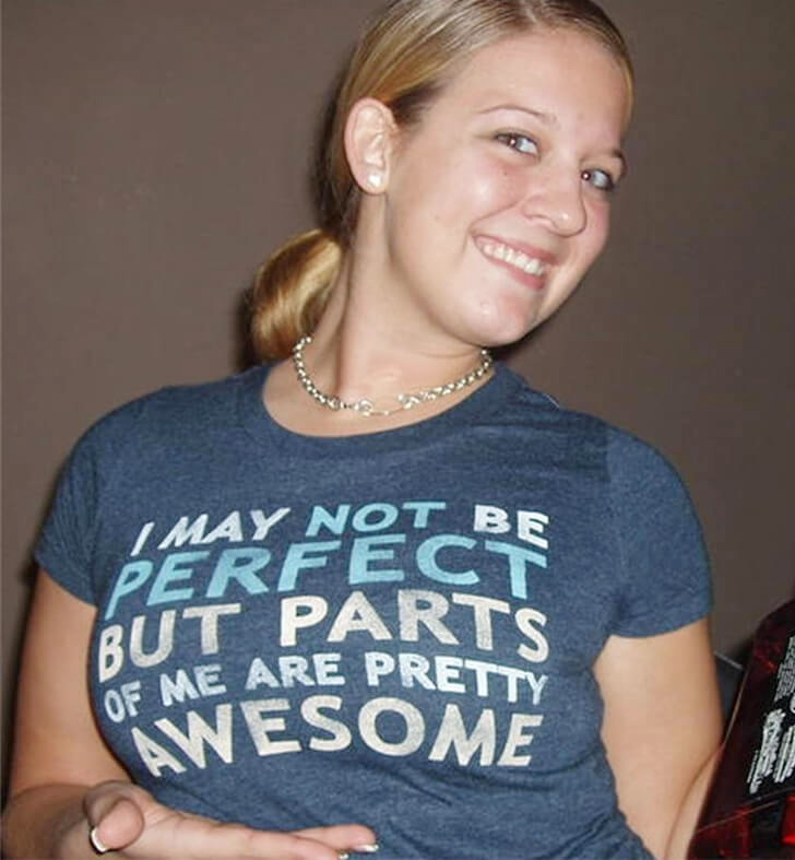 Some shirts play the role of simply clothing their wearer, but this woman’s tee takes self-confidence to the next level. By boldly proclaiming that she’s not perfect but that some parts of her are pretty awesome, she’s choosing to focus on what matters.