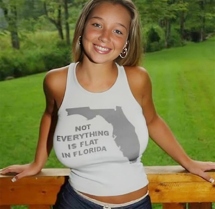 Whether Christina Lucci is referencing its landscapes or giving a nod to some not-so-flat features in the state, she’s making a lighthearted statement. Wearing this shirt, she confidently embraces Florida’s less obvious elevations. The playful wording on her tee makes sure everyone knows that the state has more than just flat surfaces, and she’s got a sense of humor.