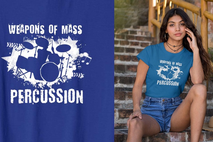 The wordplay is simple but effective, swapping destruction for percussion in a way that makes every drummer feel seen. Whether she actually owns a drum set or appreciates a good pun is anyone’s guess. The distressed white lettering gives it that worn-in vintage vibe as she manages to make music nerd humor look surprisingly stylish.