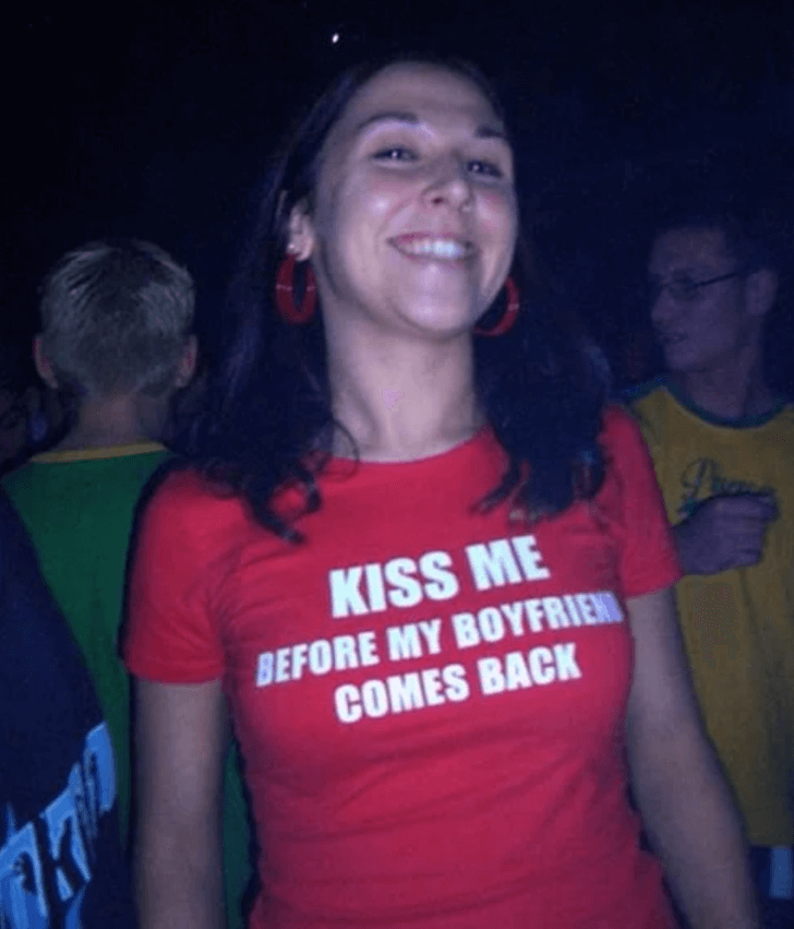 The bold white lettering makes it impossible to miss, and the audacity of wearing something like that in public is commendable. The whole setup screams prank show energy, as if her boyfriend is lurking around, ready to jump out with a camera crew. You have to wonder how many people took her up on this offer.
