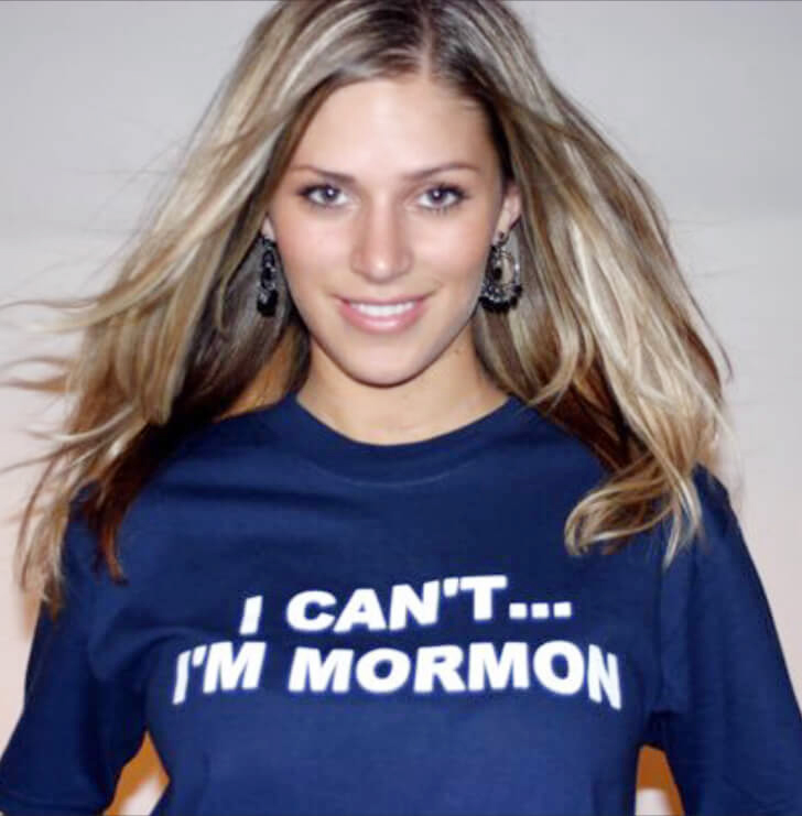 This picture might be the most polite brush-off ever printed on fabric. She’s serving up serious girl-next-door energy with the highlighted hair and statement earrings, but that navy blue shirt is doing all the talking. It’s a preemptive strike against anyone who might suggest anything different from a Mormon-based lifestyle.